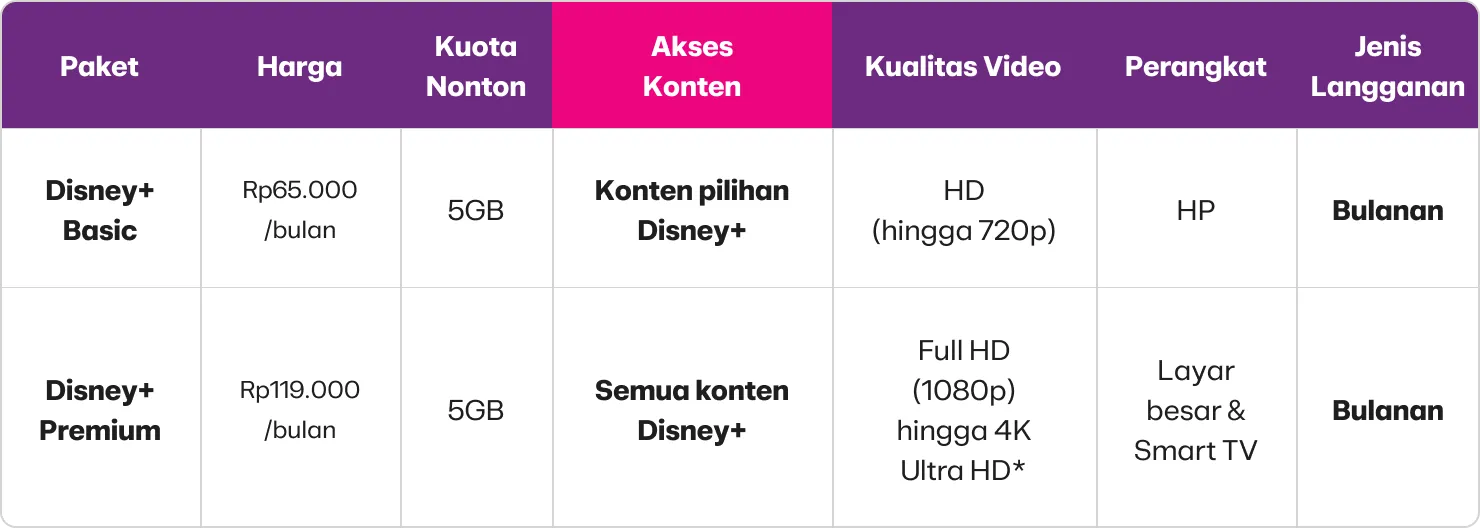 - Kuota hanya dapat digunakan untuk akses/layanan Disney+ dan tidak dapat digunakan untuk aplikasi atau situs web lain