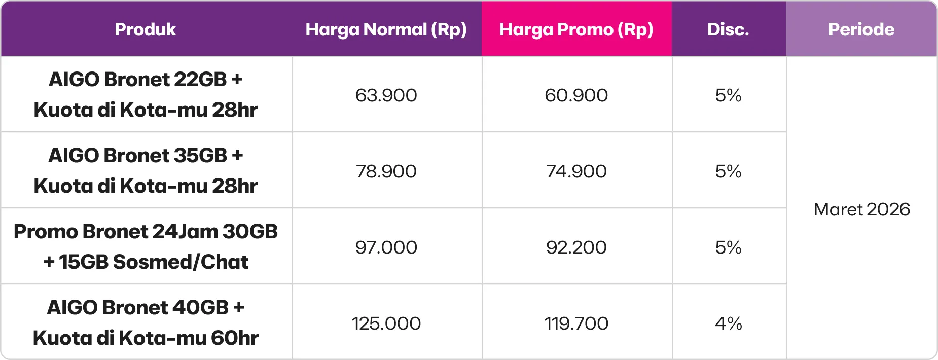 Bikin ngabuburit anti gabut! Bisa internetan super ngebut dengan AXIS AIGO Bronet. Beli AXIS AIGO di Shopee Big Ramadan Sale mulai Maret 2026, dan dapatkan diskon hingga 5%! Jangan sia-siakan kesempatannya, nikmati promo AXIS AIGO di Shopee Big Ramadan Sale sekarang juga!