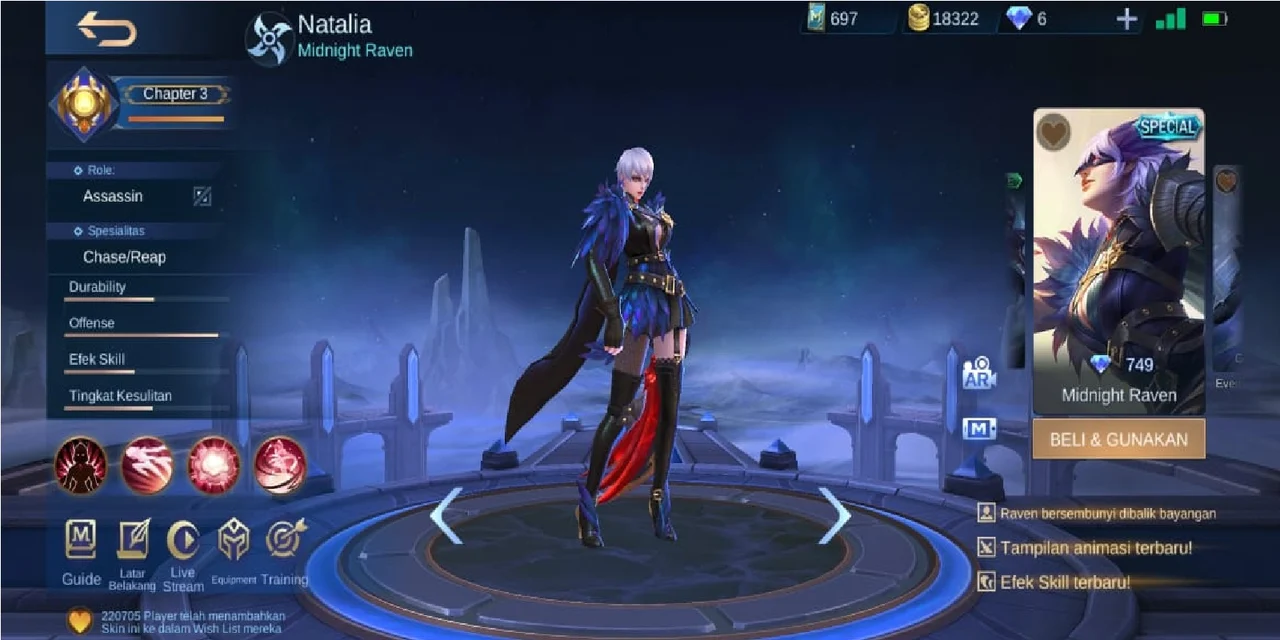 Skin Special ini mengambil tema burung gagak tengah malam (Midnight Raven). Natalia mengenakan kostum dengan jubah gelap dan detail yang menyerupai bulu gagak.